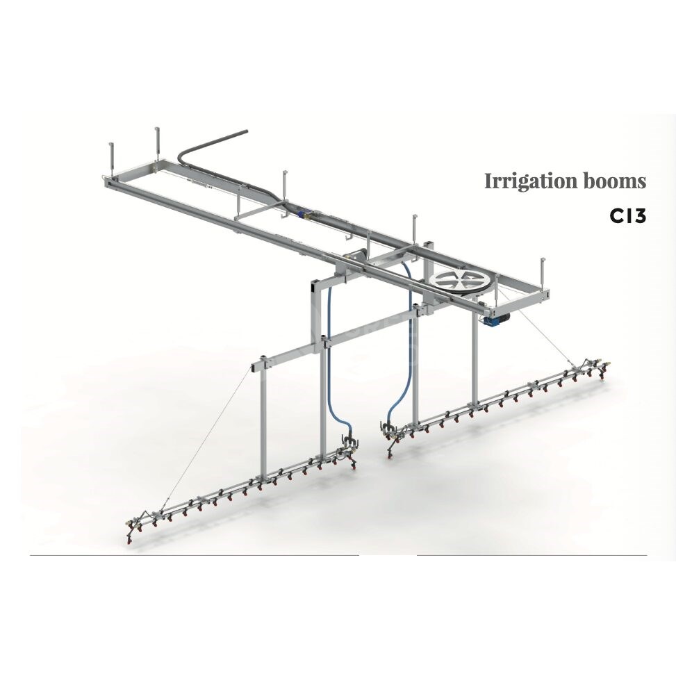 Boom Sprayer (Irrigation Booms) C13 este un echipament profesional de udare și aplicare soluții (compatibile cu instalația), destinat serelor, pepinierelor și zonelor de producție unde este necesară distribuție uniformă pe suprafețe mari, cu control precis și repetabilitate ridicată. Sistemul este proiectat pentru lucrul pe culoare de cultură și poate fi integrat în fluxuri tehnologice existente, reducând timpul de lucru și eliminând variațiile cauzate de udarea manuală.