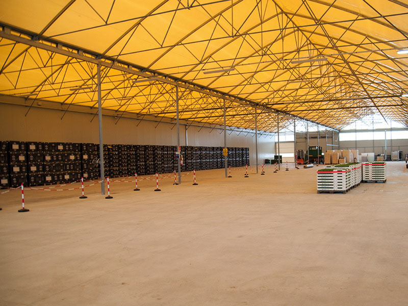 Model profesional multi-span, conceput special pentru protecția vehiculelor și utilajelor agricole împotriva grindinei, vântului și radiației solare.